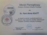 Z radością informujemy, że Pani Anna Klatt została uhonorowana Medalem Pamiątkowym Związku Żołnierzy Wojska Polskiego za życzliwość oraz wsparcie działań statutowych ZŻWP.