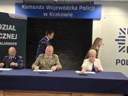 Dziś w Komendzie Wojewódzkiej Policji w Krakowie podpisano porozumienia o współpracy pomiędzy Policją, Strażą Graniczną i dyrektorami szkół, w tym naszej. Naszą szkołę reprezentowała Pani Dyrektor Anna Klatt, która wraz z przedstawicielami służb mundurowych podpisała dokument otwierający drogę do utworzenia w naszej placówce kolejnych klas mundurowych. To ważny krok w przygotowaniu młodzieży do przyszłej służby na rzecz bezpieczeństwa państwa.